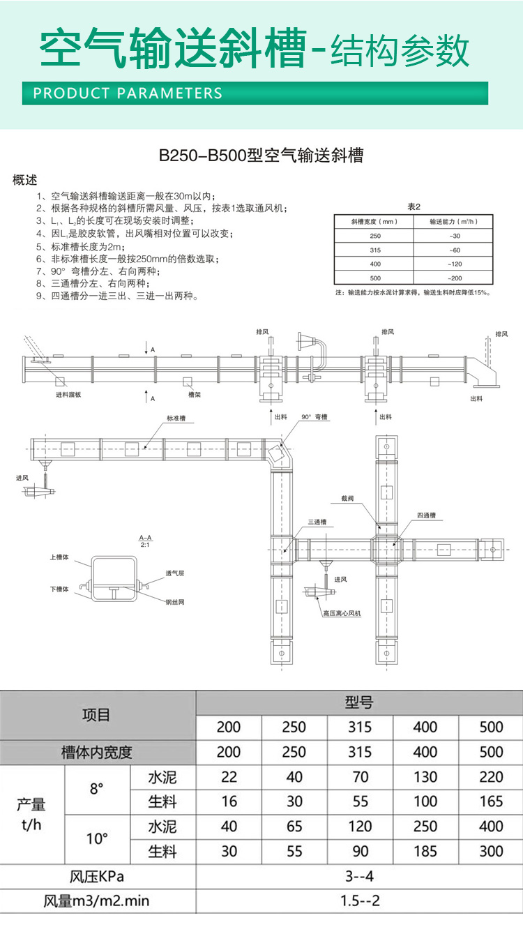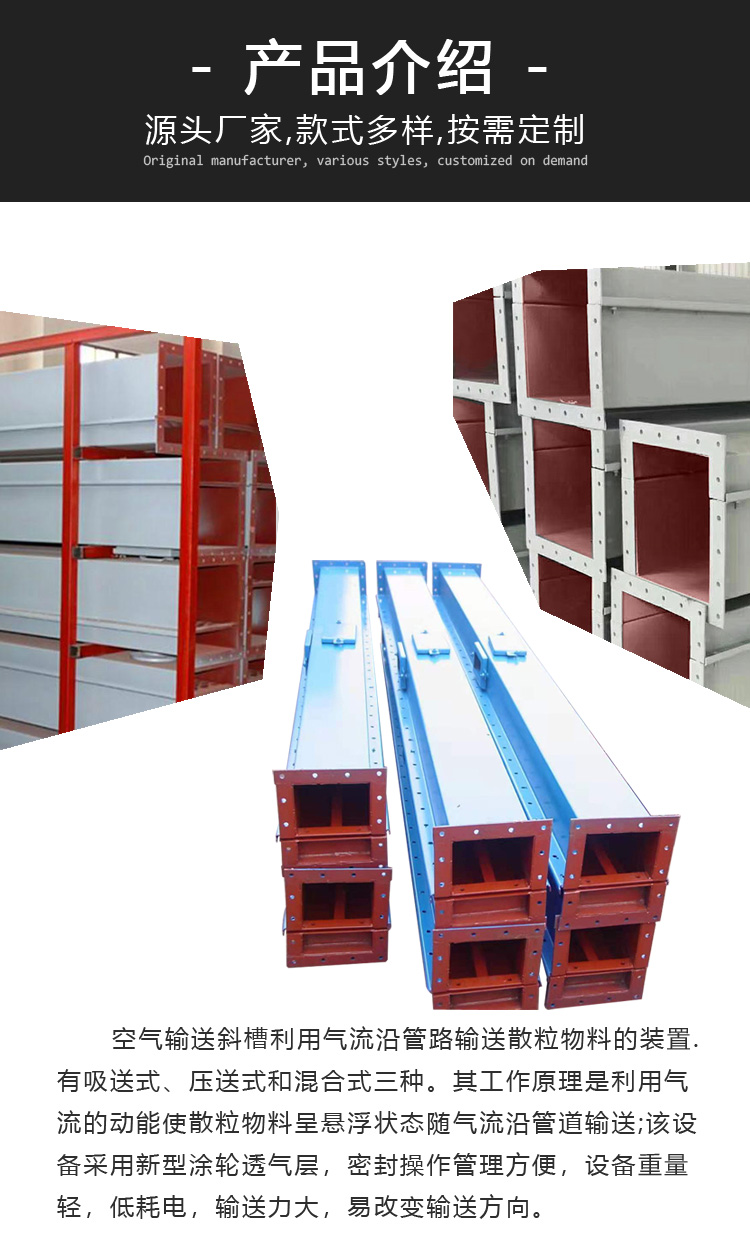 風送斜槽(也叫空氣輸送斜槽)通常用于水泥、粉煤灰等物料的力輸送設備。在輸送過程中沒有旋轉部件。與功能相同的輸送機相比,它具有維護方便、密封性好、無噪音、運行安全可靠、能耗低、輸送方向易于改變、多點進料和卸料等優點