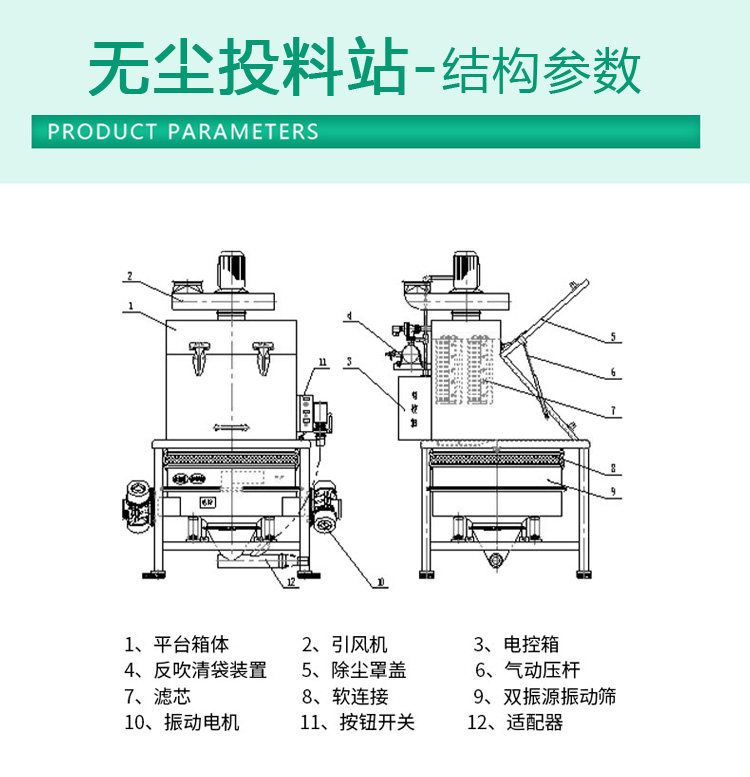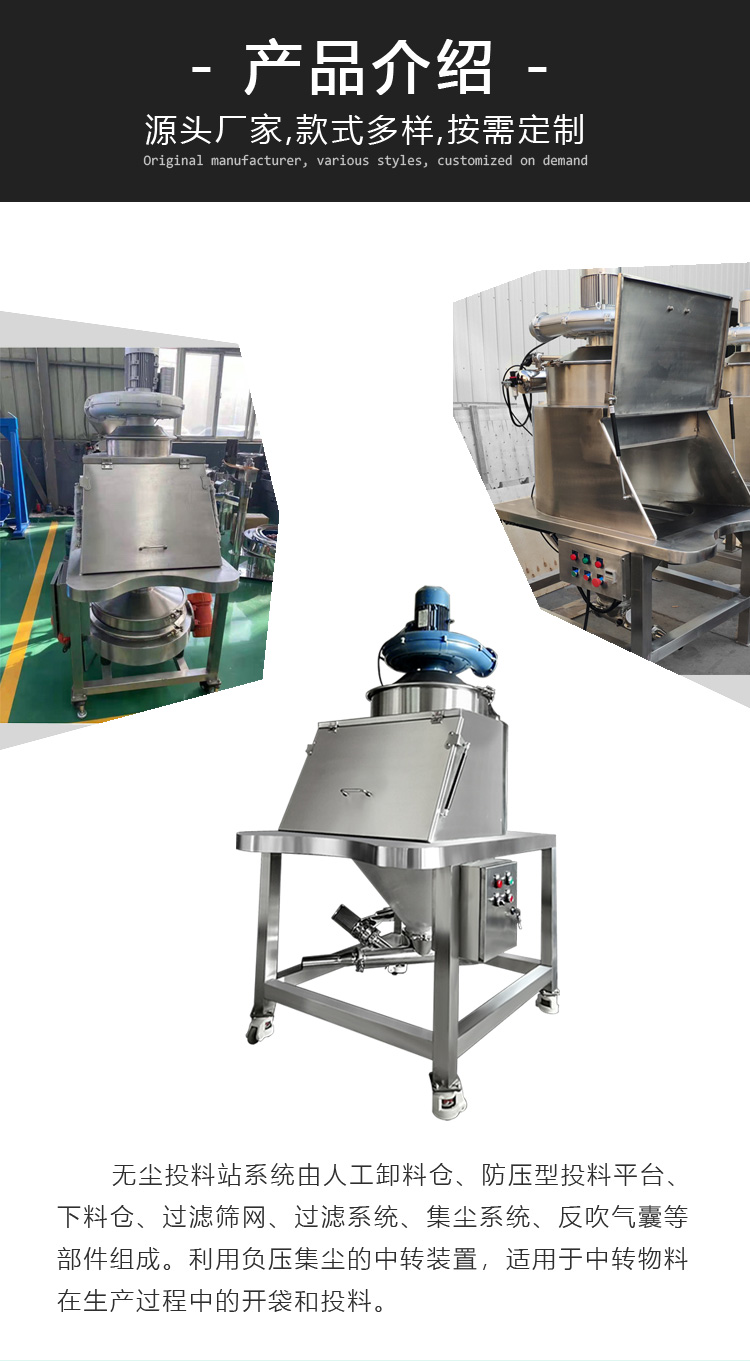無塵投料站適用于生產過程中物料的開袋和投料,廠用于制藥、化工、食品行業等。特別適用于手動人工喂料和粉末材料的預篩選。集塵風機可避免物料粉塵四處飛揚。